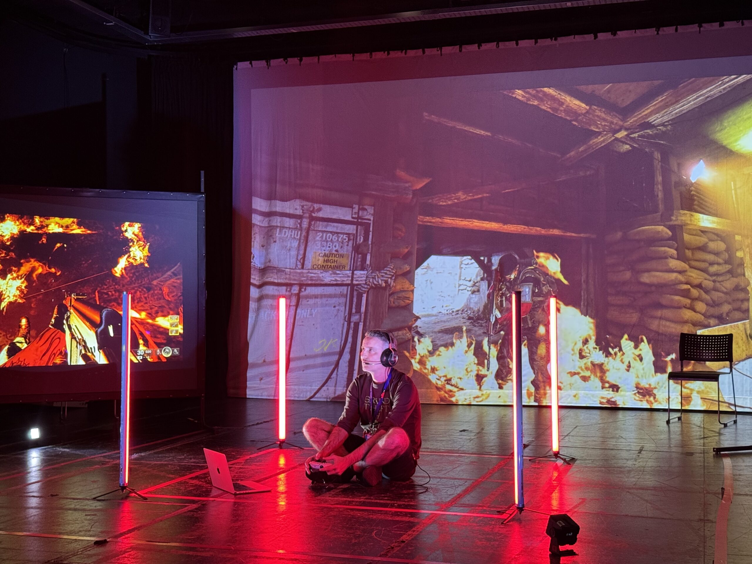Mae Sound and Fury yn brofiad theatrig hybrid sy’n ail-ddychmygu Macbeth Shakespeare ym myd rhithwir gêm ar-lein. Wedi’i berfformio ar lwyfan a’r tu mewn i’r gêm ar yr un pryd, mae’n pontio gofodau ffisegol a digidol. Nid dim ond gwylwyr yw’r cynulleidfaoedd ond ‘chwaraewyr’ – yn ymuno â brwydrau fflachdorf yn y gêm, yn siapio golygfeydd, ac yn teimlo’r effaith drwy oleuadau, sain a hapteg ymatebol. Mae integreiddio Iaith Arwyddion Prydain a chapsiynu creadigol yn sicrhau bod hygyrchedd wedi’i blethu i mewn i seiliau’r perfformiad, gan wneud y profiad hybrid yn un cynhwysol, ymdrochol, ac anrhagweladwy.