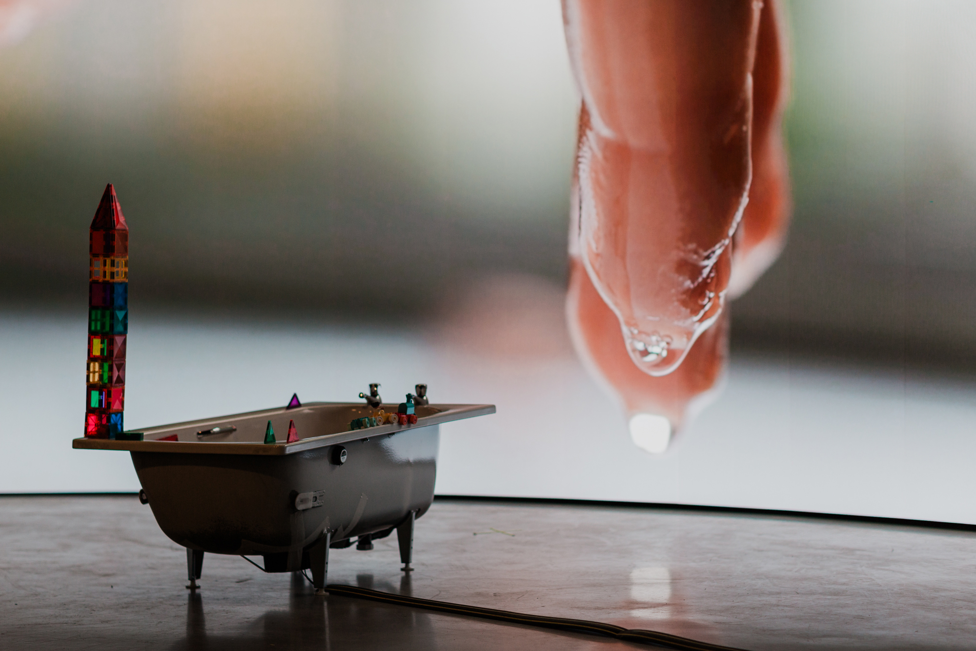 Using open-back headphones, spatial sound, haptic objects and moving image, Becoming invites audiences into an intimate yet porous listening environment. Participants encounter personal experiences of matrescence through spoken-word testimony, spatial sound and vibration, experienced as both private and shared. As they move closer to one another, new voices emerge through the headphones, shifting the experience from solitude towards connection and shared presence. At the centre of the space, a steel bath fitted with tactile transducers vibrates, sending toys rattling across its surface, inviting people to approach, touch and feel the vibrations. This sensory approach has grown from research into the difficulty of putting maternal experience fully into words.
