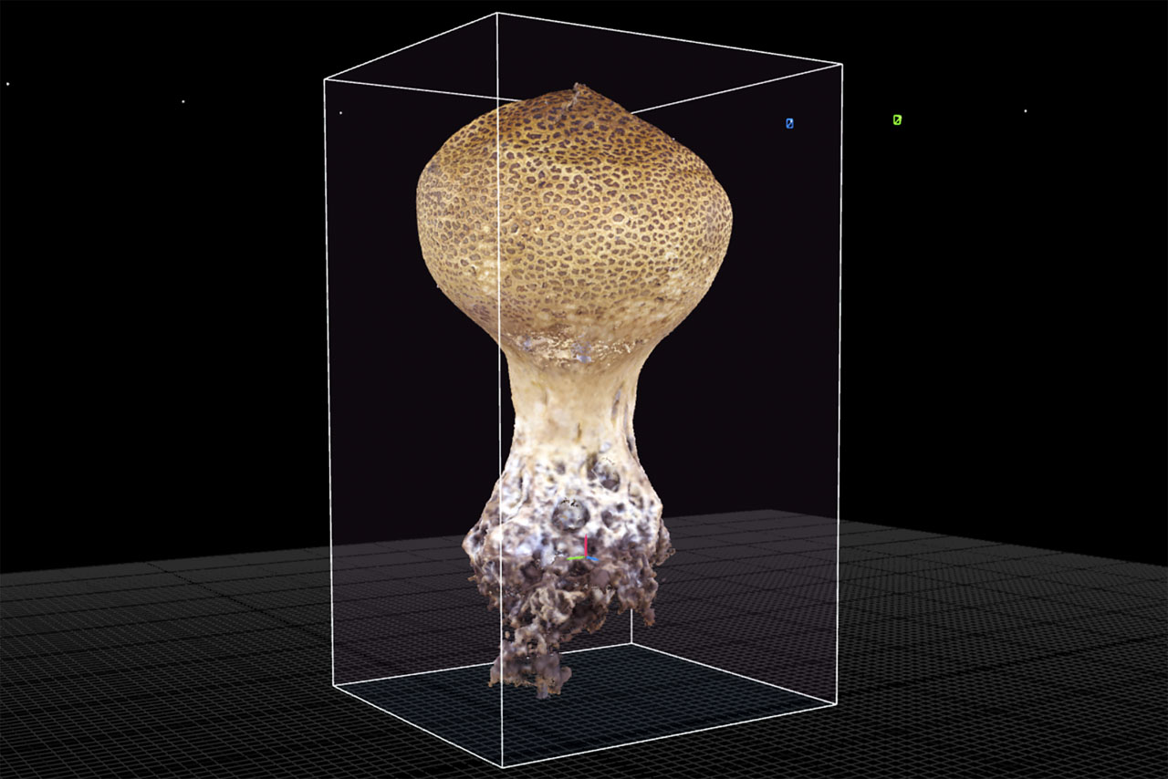 To make a 3D model of a crystallised lichen, I combined 102 overlapping photographs in order to create a textured, digital mesh that I could manipulate in a digital environment.