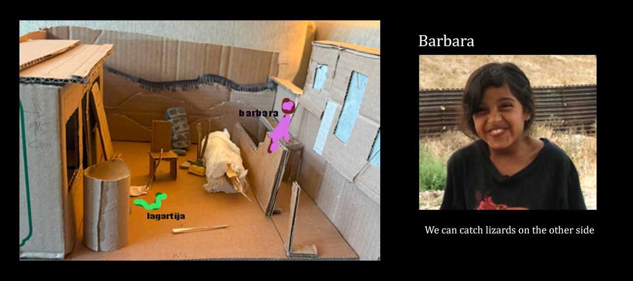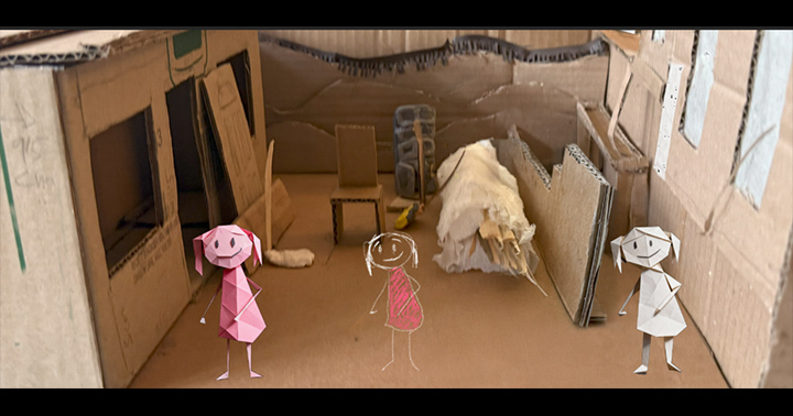 Additionally, Eva tracks the 3D character within the shanty town’s physical setting and explores ways to integrate 2D animation, particularly the children’s drawings, into the physical model. This helps convey their fantasies and perceptions of “the other side.”